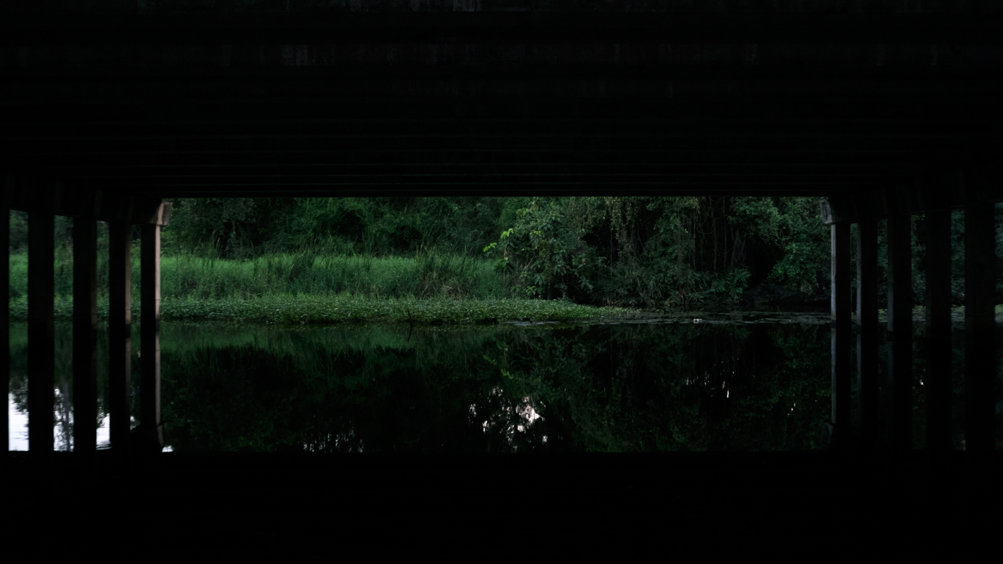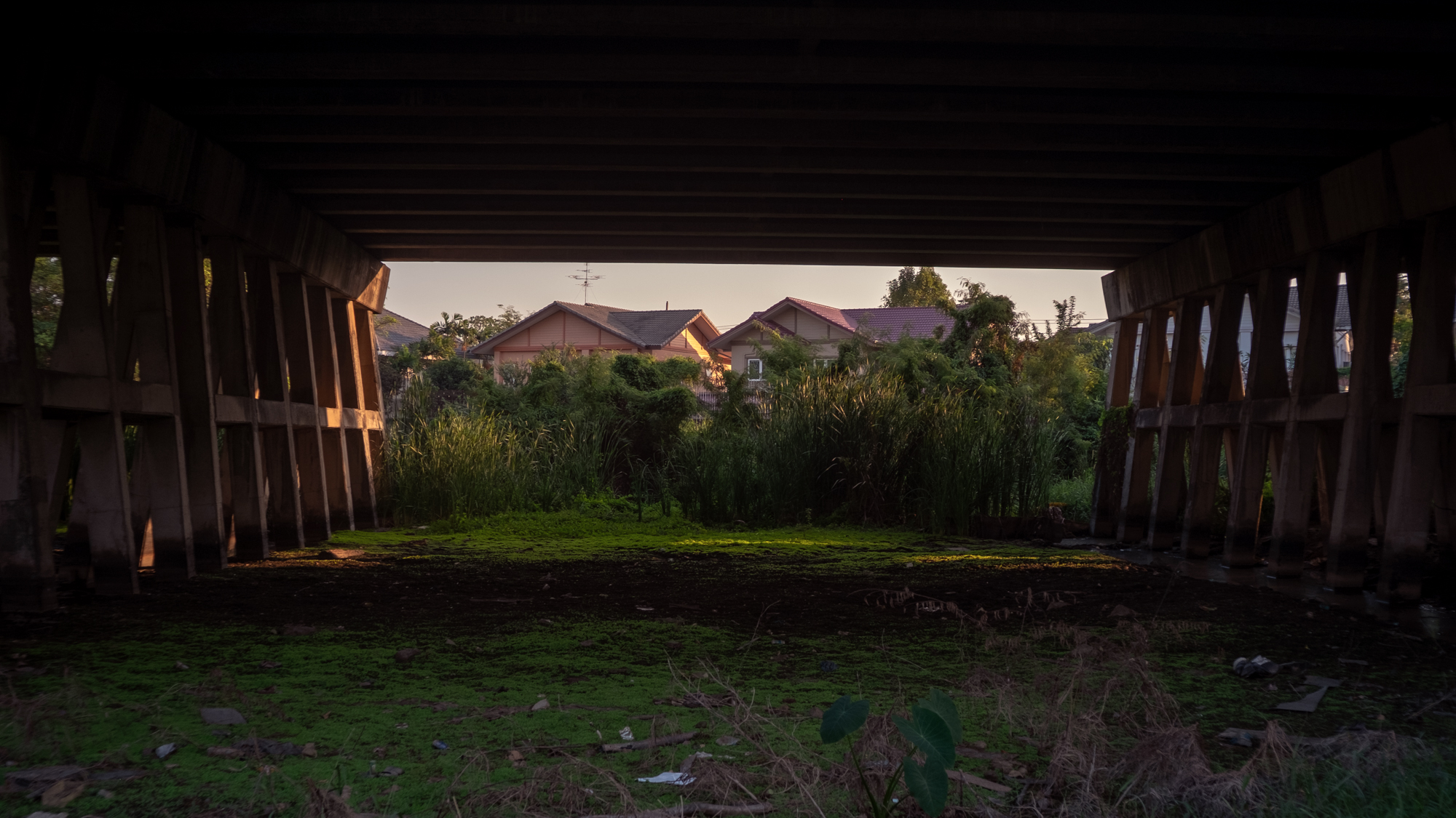 My own contribution is an older series titled Theatres (2019), created after I moved to the outskirts of Bangkok near a major expressway. Beneath its towering pillars runs what resembles a canal. The series captures views through the gaps between the expressway columns, openings that frame scenes of dense vegetation, houses, signs of development, and decay. These photographs resemble cinematic screens, projecting the landscapes that existed before the expressway appeared. The perspective is neutral, reminiscent of the New Topographics movement of the 1970s, which refrained from moral judgment and focused on showing “what is there.” Of course, the artist’s perspective subtly shapes the framing, whether or not it admits bias.